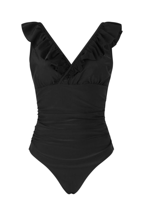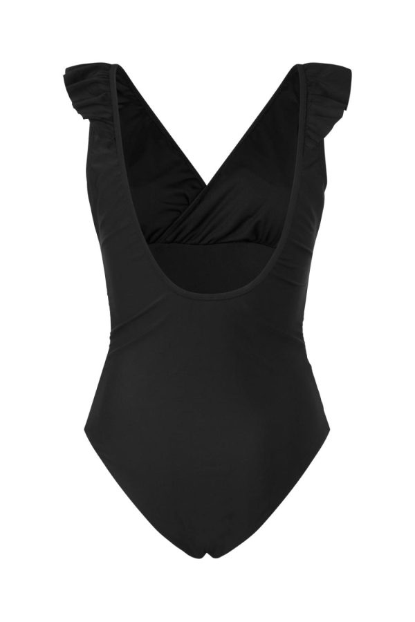 Flattering swimsuit with a deep back, wrap effect, and ruffle details, available in a cool print or solid color.The style fits true to size, so we recommend choosing the size you normally wear.• Wrap effect• V-neckline• Ruffle details• Deep backThe models are wearing sizes 36-40.Materials: 82% recycled polyamide, 18% elastane.