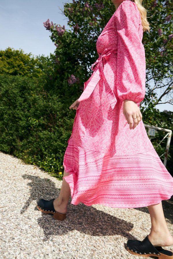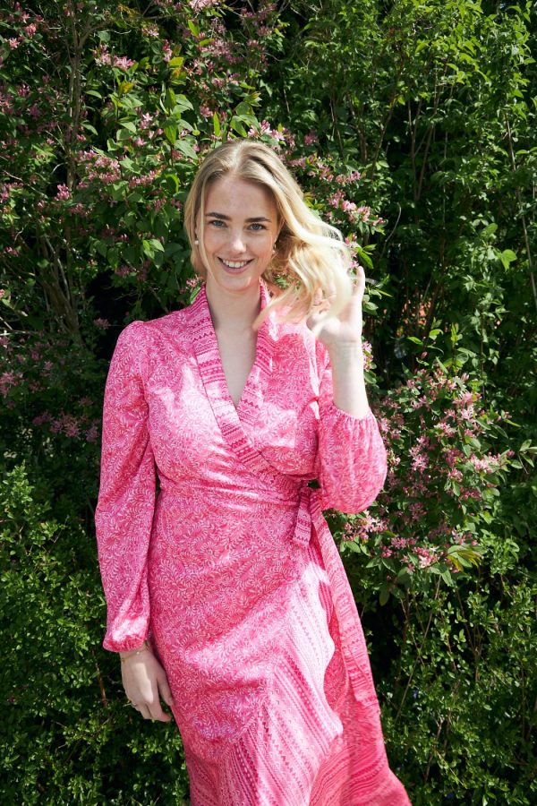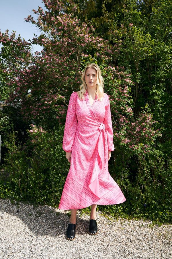 NOTE: Lara dress pale peony and pale peony blue is a pre-order item for delivery later.Expected delivery time: In the picture you will find an estimated time of arrival – this is when we expect to have the item in stock. If other goods are ordered together with the ordered goods, they will be sent separately.Right of return: We charge the full amount when your order is shipped. Your 14-day right of return begins from the moment you receive the physical goods.Elegant long wrap dress with a cool print and ruffle details at the hem. The wrap design creates a flattering silhouette.The dress is true to size, so we recommend choosing your usual size.• Wrap dress• Printed design• Long sleevesThe model is 171 cm tall and wears a size 36.Material: Made from 100% recycled polyester.