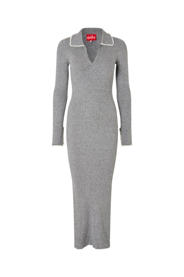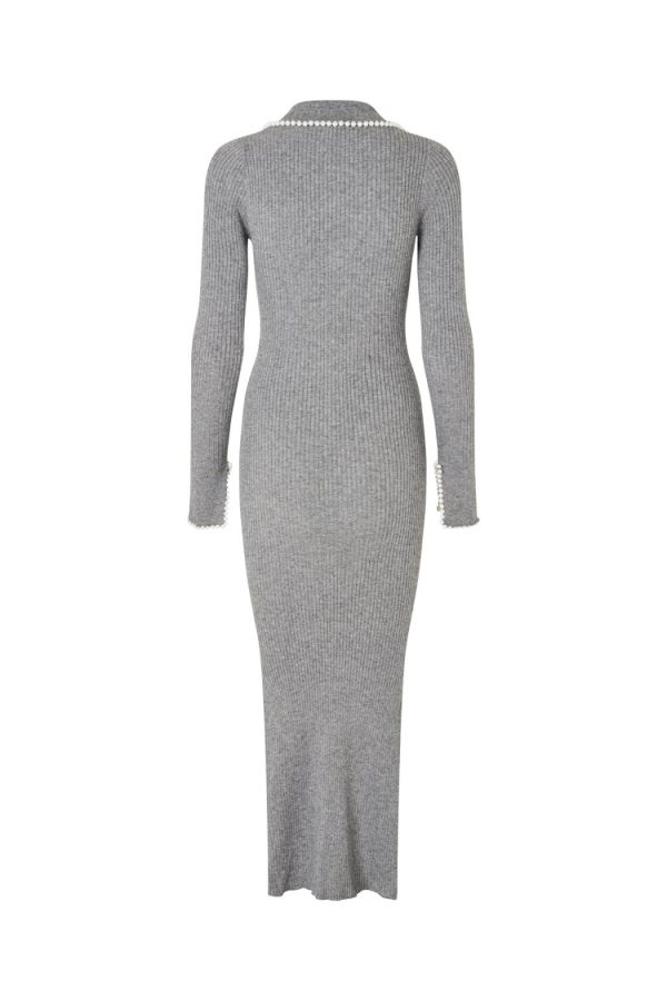 Slim fit knitted dress with a V-neckline and a cool collar. The dress has long sleeves with slits, allowing the sleeves to fall beautifully over the hands. It is decorated with pearls along the collar and sleeve openings. Made from 50% viscose, 22% nylon, and 28% polyester.The model is 176 cm tall and wears a size 36.