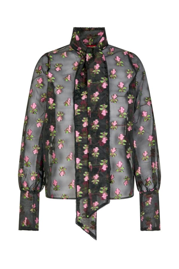 Beautiful blouse crafted from floral embroidered sheer organza fabric. This slightly transparent material is light and airy, perfect for layering. You can style it with a bralette or a top underneath. The blouse features ties around the neckline that can be fastened into a large bow. Made from 85% polyester and 15% nylon.The model is 176 cm tall and wears a size 36.
