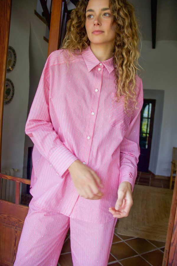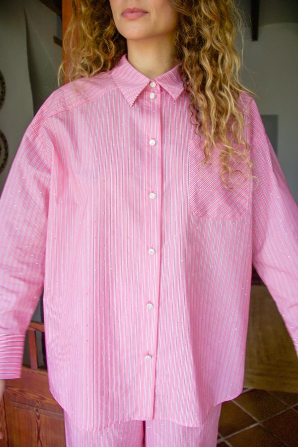 Oversized shirt with stripes and all-over sparkling stones. The shirt also features statement buttons and a chest pocket. Pair it with the Nathan pants for the complete look.The style is true to size, so we recommend choosing the size you normally wear.• Oversized• Sparkling stones• Statement buttonsThe model is 177 cm tall and wears a size 36.Material: 85% cotton and 15% nylon.