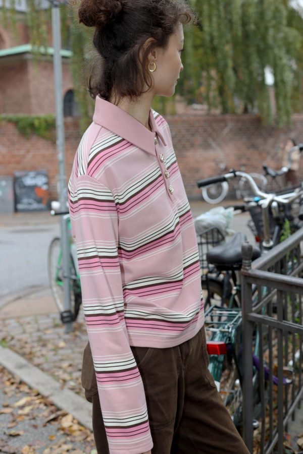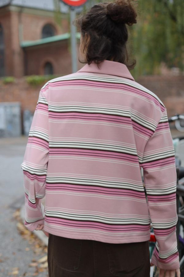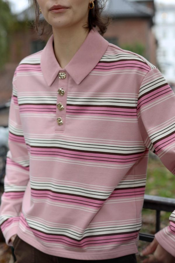 The blouse has a classic polo collar and four big buttons in the front, which allows you to wear it either open or closed. The blouse has a boxy/oversized fit and is made from 50% cotton and 50% polyester.The model is 174 cm tall and wears a size 36.The shirt must be washed separately first time.